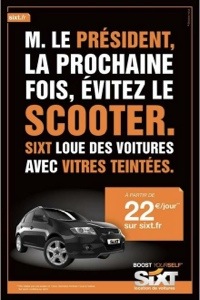 SIXT tente les teintées bondamanjak 12 ans ago À l’heure où le feuilleton Hollande/Trierweiler/Gayet est sur toutes les lèvres, la pub a une belle envie de surfer. Et c’est le loueur de voitures #SIXT qui est le premier à prendre la vague. Eh oui c’était tentant.