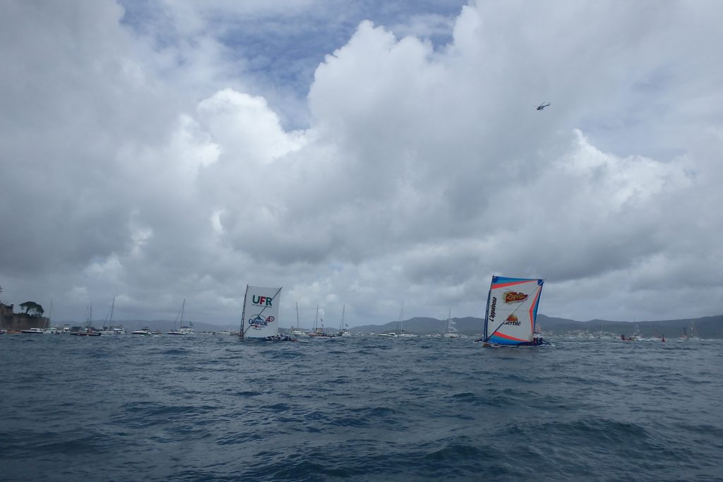 Un très beau prologue. Un temps clément après les grains de la nuit et du matin qui ont occasionné des incertitudes et le report du départ d’une heure. Un beau défilé des coursiers jusqu’au podium de La Savane. Un départ chaotique pour les yoles du François empêtrées et qui laissent filer celles du Robert (à bâbord et à tribord sur la photo). Une mer facile à naviguer et un vent régulier. Un magnifique UFR/Chanflor qui mène la course de bout en bout. Une toute aussi magnifique remontée de Zappett/Gerblé/Apaloosa partie très loin derrière qui ajuste pratiquement tout la flottille pour n’être plus qu’à deux longueurs de canot du vainqueur à l’arrivée, CTDM/EDT et Tremplin’s/Dom Orthopédie (la yole de Fort-de-France) qui finissent 3ème et 4ème, des milliers et des milliers de spectateurs massés sur tous les bords de mer de Fort-de-France malgré l’onde tropicale qui menaçait. Il manquait juste le soleil et un ciel bleu. Ce 32ème Tour de Martinique des Yoles-Rondes est bien parti.