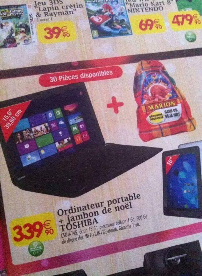 #Toshiba se lance dans le jambon de Noël bondamanjak 11 ans ago On arrête pas le progrès selon ce dépliant d’hyper distribué en #Guadeloupe, la marque #Toshiba se lancerait dans le jambon de Noël. En attendant le punch au coco #Nike. On se marre. Trop fort les mecs.