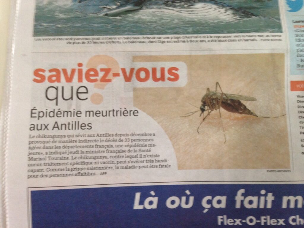 Souvent, il suffit d’un rien. Un poil de moustique ou de castor pour mettre en péril une activité. En #Martinique et en #Guadeloupe, le tourisme risque d’être en apnée puisque l’épidémie de #chikungunya semble vouloir faire dans le développement durable. Le hic c’est qu’ à travers le monde, l’info circule comme ici au #Canada avec un titre sans équivoque « Epidémie meurtrière aux Antilles ».
