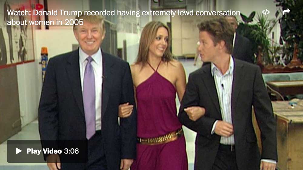 Dans cette vidéo datant de 2005 et rendue publique aujourd’hui par le Washington Post, Donald Trump explique ses techniques de séduction plutôt brutales et affirme même avoir pourchassé une femme marié, sans succès.