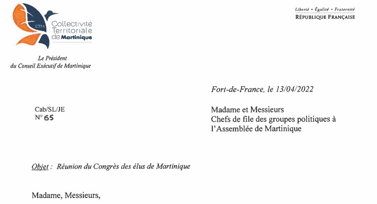 Bizarrement, en Martinique, le Président du Conseil Exécutif de la Collectivité Territoriale de Martinique, dont personne n’a oublié qu’il laissait croire au niveau international qu’il était le Président de la Martinique, lorsqu’il n’était qu’un simple président d’une Région française, a eu l’idée cette semaine d’un Congrès des élus de Martinique « pour doter la Martinique des leviers du développement, de l’émancipation et du progrès dont elle a besoin ». Alors, il a adressé une lettre aux chefs de file de la CTM. Il faut constater que cette lettre est loin, très loin dans la forme comme dans le fond, de celle qu’adressa Aimé Césaire à Maurice Thorez.