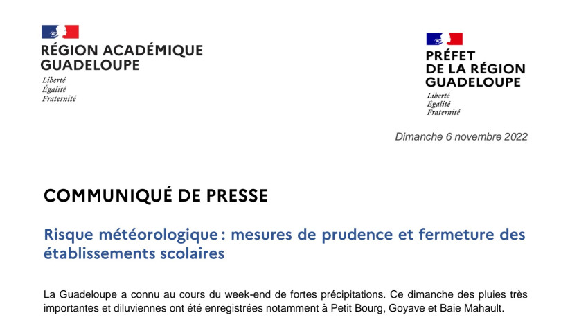 Dans un communiqué publié ce dimanche 6 novembre, le Préfet de Guadeloupe avec la Rectrice de l’Académie, a demandé aux maires de Guadeloupe, La Désirade, Les Saintes, Saint-Martin et Marie-Galante de garder les écoles fermées demain lundi 7 novembre et précisé que les collèges et lycées le seront aussi. Il n’y aura pas de transport scolaire.