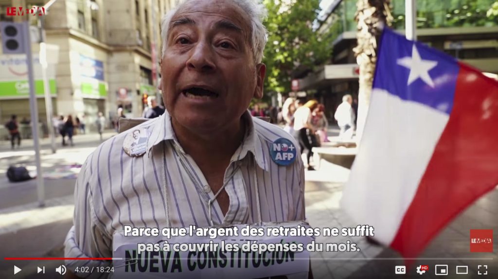 Dans ce reportage poignant, Nicolas Margerand et Erasmos Salas nous donnent à voir un Chili en pleine insurrection, dressé contre le système économique néolibéral mis en place sous la dictature d’Augusto Pinochet. Focus sur les seniors chiliens, poussés à la misère, contraints de travailler jusqu’à leurs dernières forces, pressurisés par un système de retraites privatisé, au seul bénéfice de puissants fonds de pension.